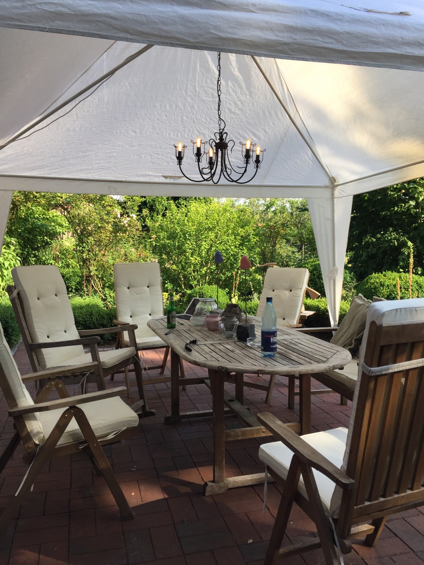 Unsere Terasse ist südlich ausgerichtet, sodass wir über unser Zelt und den Sonnenschirm froh sind. Die Wärme staut sich gottlob nicht, da wir die Seitenwände nicht eingebaut haben. Am Abend, als wir in kleiner Runde zusammensitzen, fällt mir die Idee mit dem Kronenleuchter ein. Gesagt getan, wird er aufgehängt. Schick oder nicht? Abends ist das zusätzliche und gedämpfte Licht angenehm.