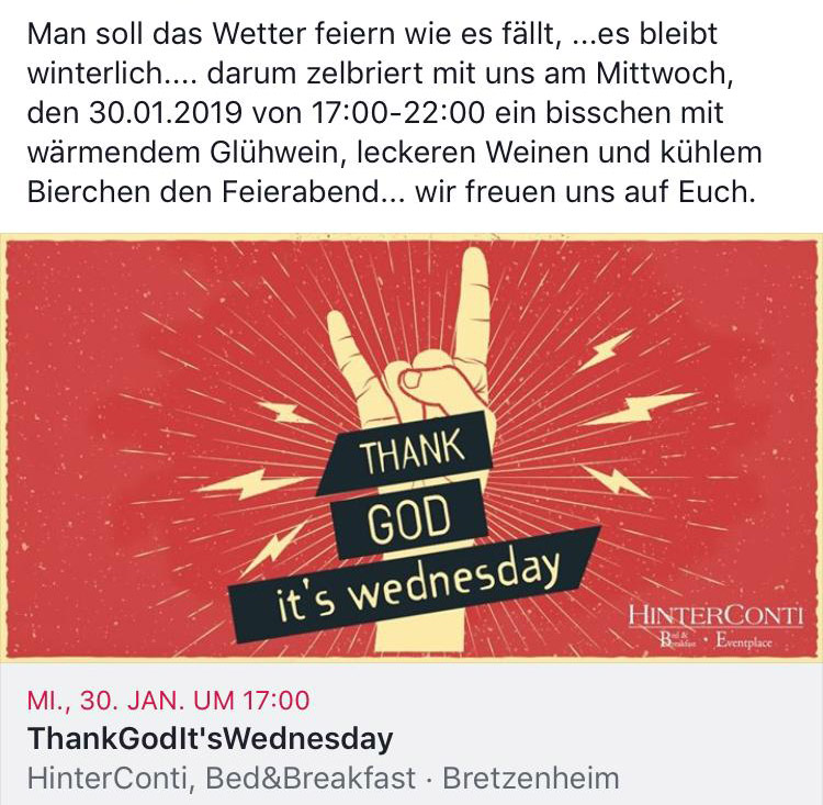Aber zunächst reise ich nach Bad Kreuznach. Das liegt inzwischen gute 500 km von meinem Heimatort entfernt, sodass ich einen Tag vorher ankomme und im HinterConti übernachte. Und wie der Zufall es will, findet gerade am Abend meiner Ankunft das „THANK GOD it’s wedneday“ statt. Die Gelegenheit lasse ich mir nicht entgehen. Auch unsere Freunde Jan und Elli sind dabei – die Freude ist daher groß und der Abend einfach fantastisch.