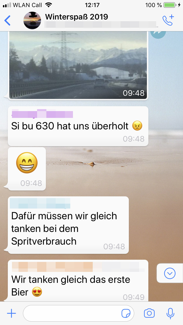 Eigens für den Winterspaß haben wir eine WhatsApp-Gruppe gegründet und wir bekommen beim Einsteigen schon die ersten Meldungen herein. Die ersten sind schon am Ziel und die anderen feiern im Auto kräftig auf unser gemeinsames Wochenende.