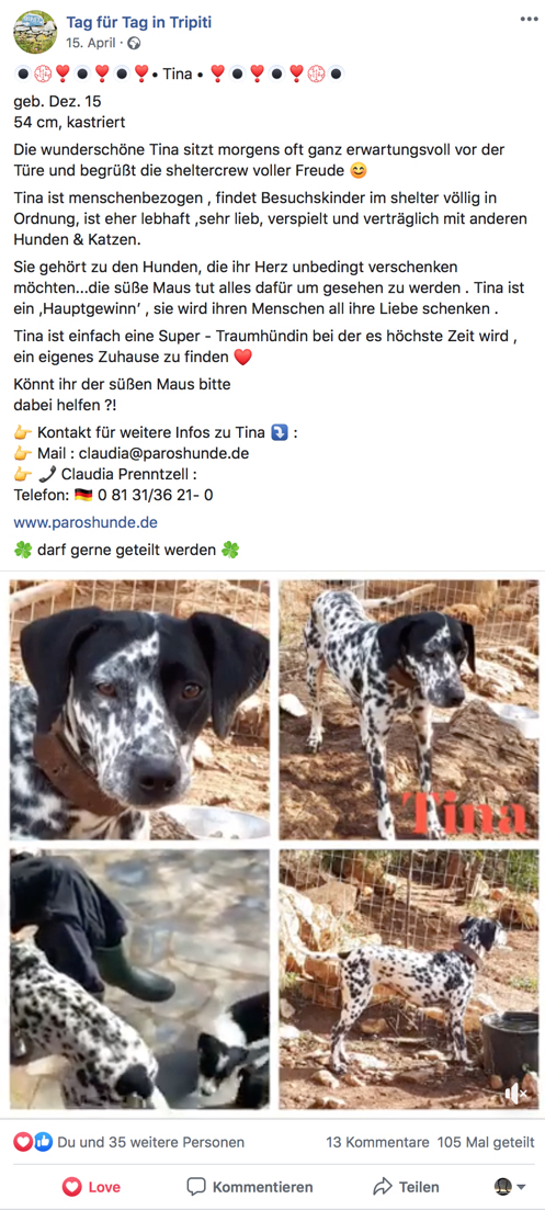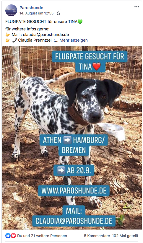 Die Überführung ist momentan unser großes Problem. Wir brauchen einen Flugpaten, damit Gina nach Deutschland begleitet werden kann. Und wahrscheinlich landet sie leider in München. Das wäre für alle Beteiligten eine echte Herausforderung. Das sind Stunden, die sie mit uns, als fremde Personen und dann noch im Auto verbringen müsste. Zum Tierarzt ist sie schon ein paar Mal gefahren worden, aber nun kommt diese lange Fahrt auf sie zu…