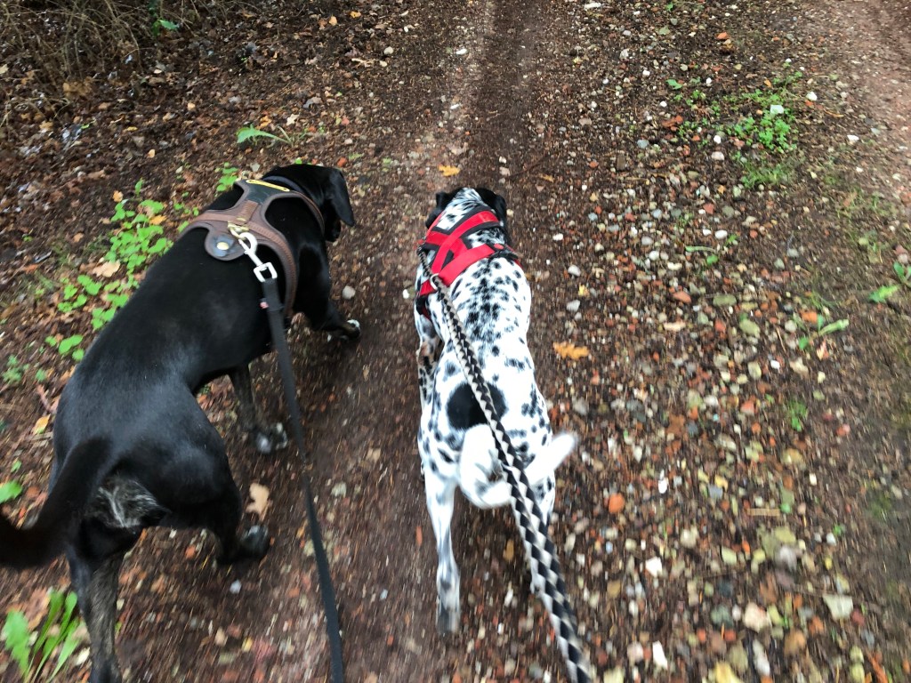 Spazieren gehen mit zwei Hunden ist einfach, wenn sich beide an Regeln halten. Ich habe Georgia, bevor Gina dazu gekommen ist, das Linksgehen beigebracht. Inzwischen und Gottlob beherrscht sie das auf Kommando. Gina bringe ich gerade bei, überwiegend rechts von mir zu gehen. So entsteht auch kein Leinenspaghetti.Gina ist noch an der kurze Leine und Georgia läuft brav an der langen Leine. Ich habe extra einen Laufgurt, wo beide dran sind. So sind immer die Hände für die Korrektur frei. Da beide Jägerinnen sind, bringt es eh nichts, die beiden von der Leine zu lassen.
