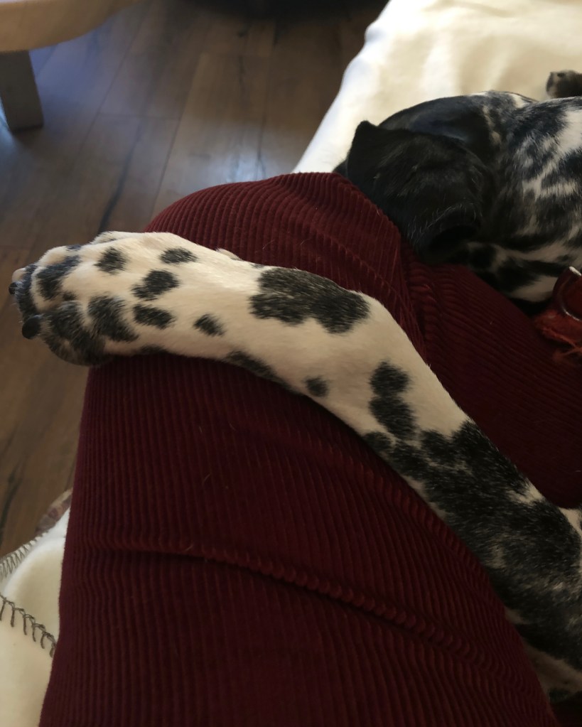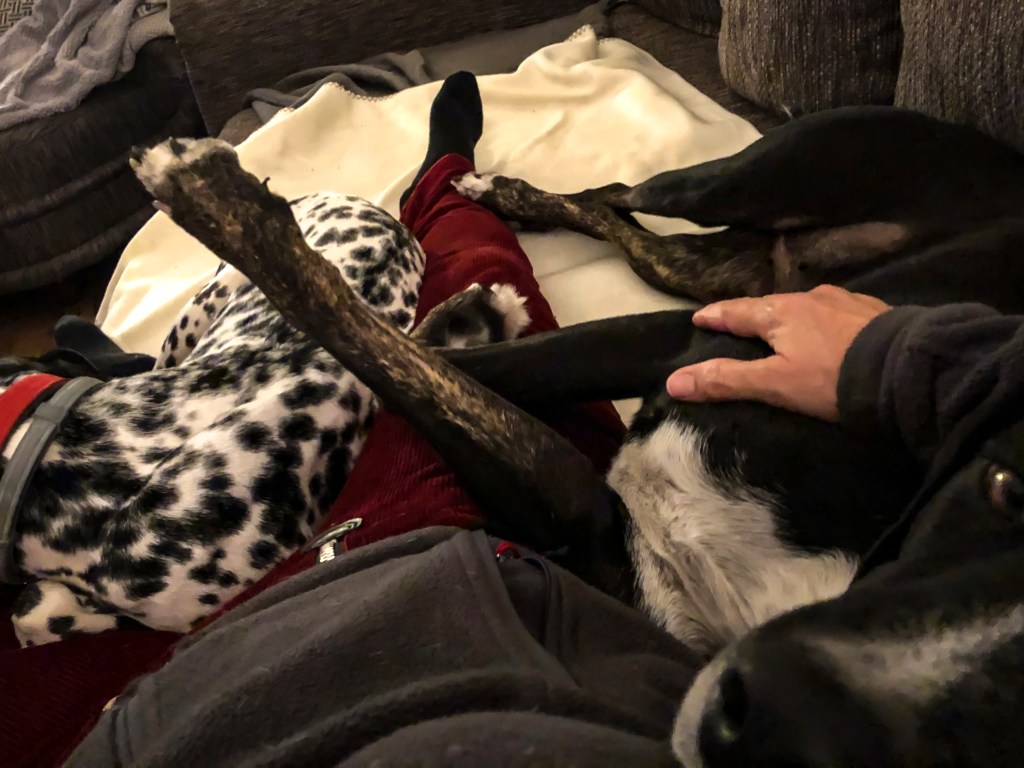 Allein lassen wir sie immer wieder einmal, das klappt ganz gut. Ich traue nur Gina noch nicht ganz über den Weg. Daher bleiben die meisten Türen für sie vorerst verschlossen. Wenn Gina abends mit auf’s Sofa darf (präpariert mit zig Hundedecken), dann ist erst einmal Tumult angesagt. Die dreht sich wie ne Wilde tausend mal um ihre eigene Achse, quetscht den Kopf zwischen meine Arme und springt unruhig umher😂, will sich hinter mir ablegen, strampelt herum, springt vom Sofa, um im nächsten Moment wieder drauf zu springen… Währenddessen liegt Georgia schon entspannt neben mir. Wir schauen uns dann beide immer an und warten einfach geduldig ab, bis die Bekloppte sich ausgetobt hat. Und wenn das dann eintrifft, dannnnn, ja dann kehrt endlich Ruhe ein. 😉