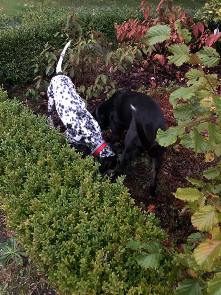 Das hatte ich ja schon eingangs erwähnt, dass sie das Jagen schon reichlich in unserem Garten unter Beweis gestellt haben. Beide (da ist Gemeinsamkeit ganz groß geschrieben 😂) jagen da mitunter hinter allem her und wenn es nur das herabfallende Blatt ist. 😂 Die würden daher richtig Unsinn machen, wenn sie frei herumlaufen könnten.