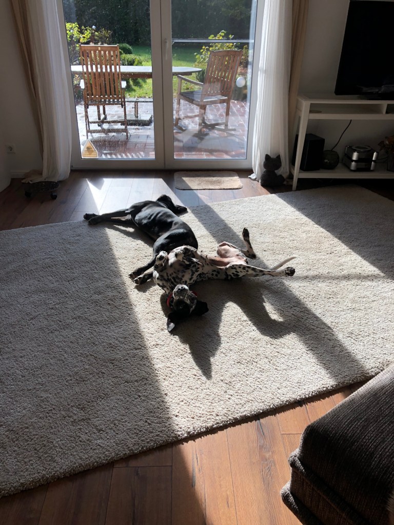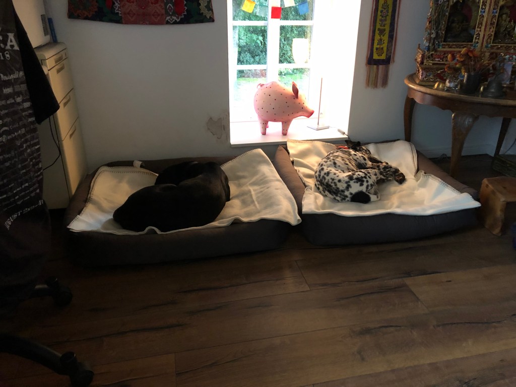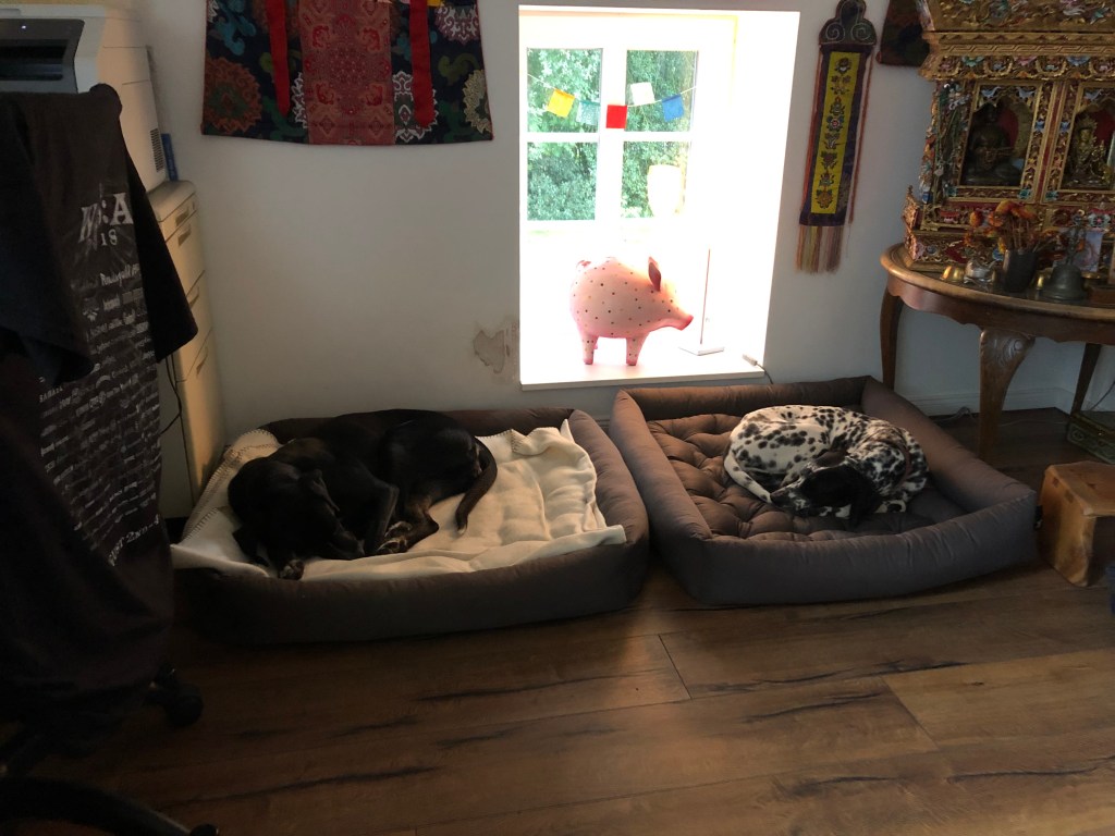 Gerade hatten beide ihr Abendbrot und ich bin zurück in meinem Büro, um zum Beispiel diesen Artikel zu Ende zu schreiben. Gina und Georgia sind mir nach und nun liegen sie hier gemeinsam auf ihren Decken und schlafen ruhig und entspannt nebeneinander.