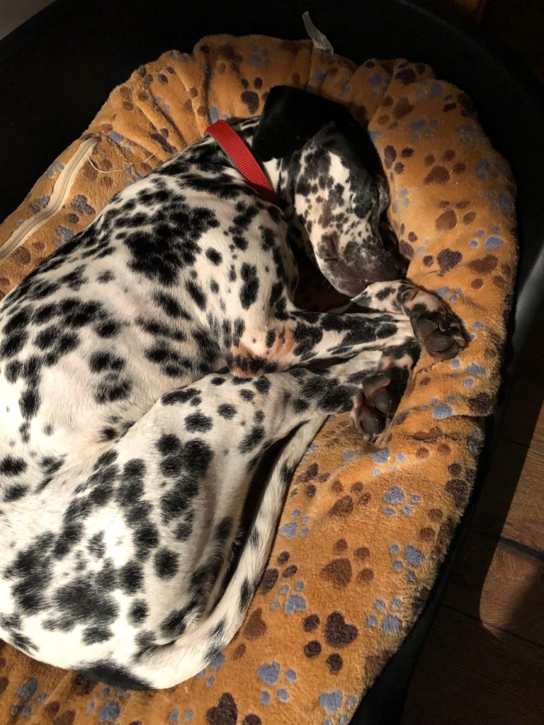 Als ich nach Hause komme… und jetzt kommt das Kuriose, ist scheinbar die Welt um Gina eine andere geworden. Sie geht auf ihre Decke und schläft erst einmal. Eigentlich folgt sie mir sofort, wenn ich mich von ihr entferne und ins Büro gehe. Doch sie bleibt unten auf ihrer Decke liegen. Nachmittags gehe ich dann mit beiden Hunden unsere große Runde und auch abends wirkt Gina viel ausgeglichener. Sie rangelt nicht herum, um auf unser Sofa zu kommen. Sie geht brav auf ihre Decke und kommt darauf wenig später zur Ruhe. Ob meine Tierärztin ihr ein Beruhigungsmittel gegeben hat? 🤔 Als wir schlafen gehen, protestiert Gina nicht. Sie geht auf ihre Decke und tut es uns gleich.