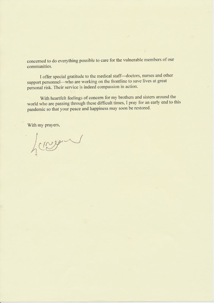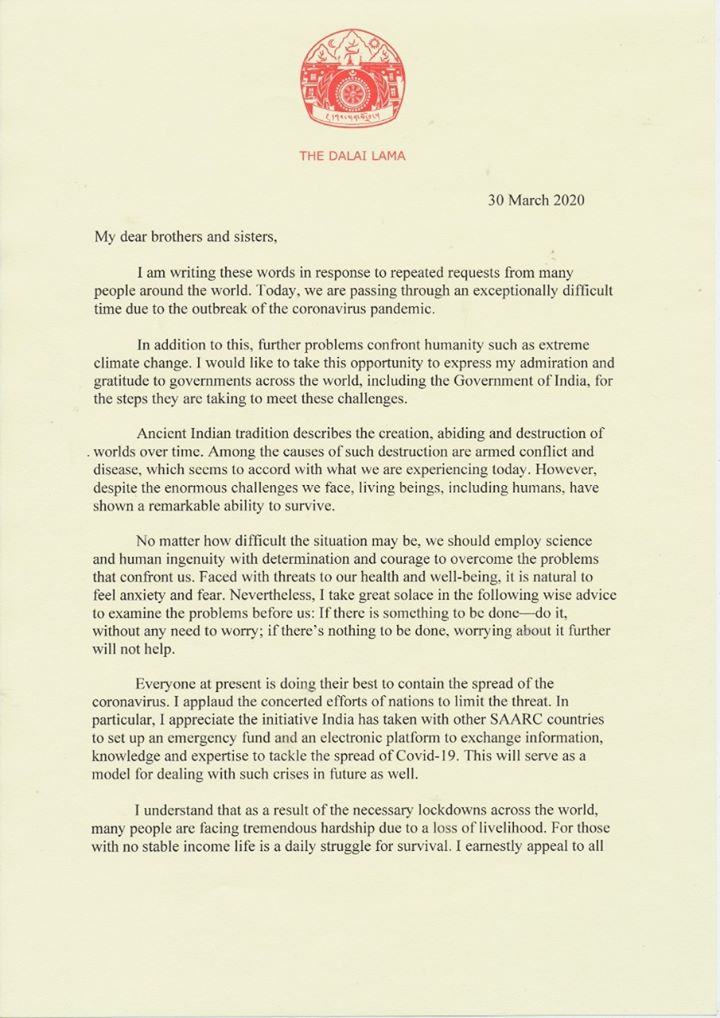 I am writing these words in response to repeated requests from many people around the world. Today, we are passing through an exceptionally difficult time due to the outbreak of the coronavirus pandemic.In addition to this, further problems confront humanity such as extreme climate change. I would like to take this opportunity to express my admiration and gratitude to governments across the world, including the Government of India, for the steps they are taking to meet these challenges.Ancient Indian tradition describes the creation, abiding and destruction of worlds over time. Among the causes of such destruction are armed conflict and disease, which seems to accord with what we are experiencing today. However, despite the enormous challenges we face, living beings, including humans, have shown a remarkable ability to survive.No matter how difficult the situation may be, we should employ science and human ingenuity with determination and courage to overcome the problems that confront us. Faced with threats to our health and well-being, it is natural to feel anxiety and fear. Nevertheless, I take great solace in the following wise advice to examine the problems before us: If there is something to be done—do it, without any need to worry; if there’s nothing to be done, worrying about it further will not help.Everyone at present is doing their best to contain the spread of the coronavirus. I applaud the concerted efforts of nations to limit the threat. In particular, I appreciate the initiative India has taken with other SAARC countries to set up an emergency fund and an electronic platform to exchange information, knowledge and expertise to tackle the spread of Covid-19. This will serve as a model for dealing with such crises in future as well.I understand that as a result of the necessary lockdowns across the world, many people are facing tremendous hardship due to a loss of livelihood. For those with no stable income life is a daily struggle for survival. I earnestly appeal to all concerned to do everything possible to care for the vulnerable members of our communities.I offer special gratitude to the medical staff—doctors, nurses and other support personnel—who are working on the frontline to save lives at great personal risk. Their service is indeed compassion in action.With heartfelt feelings of concern for my brothers and sisters around the world who are passing through these difficult times, I pray for an early end to this pandemic so that your peace and happiness may soon be restored.