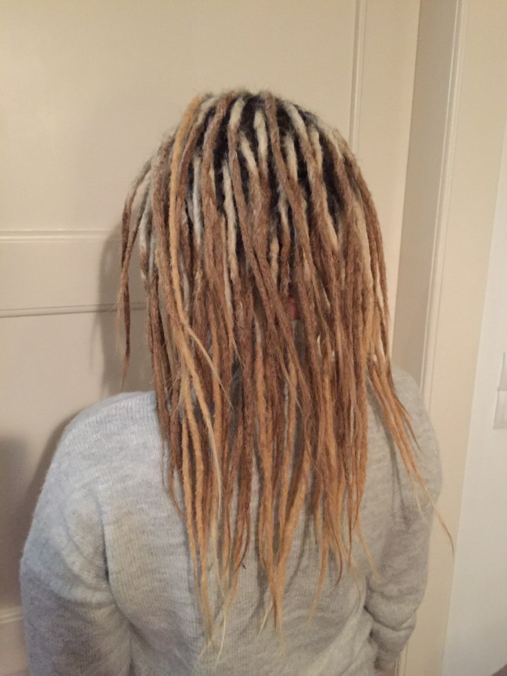 Ich habe sie dieses Mal alle und bis in die Spitzen neu verhäkelt, um die Schwachstellen zu finden und locker gewordene Stellen wieder straff zu häkeln – quasi sind sie komplett von mir restauriert worden. Ansonsten häkle ich gar nicht mehr. Muss nämlich nicht sein, die entwickeln sich echt von selbst. Zumal, durch das ständige Häkeln stört man den Entwicklungsprozess der Dreads und sie werde wieder kratziger und irgendwann brechen sie auch – gerade Extensions mögen kein permanentes Häkeln.