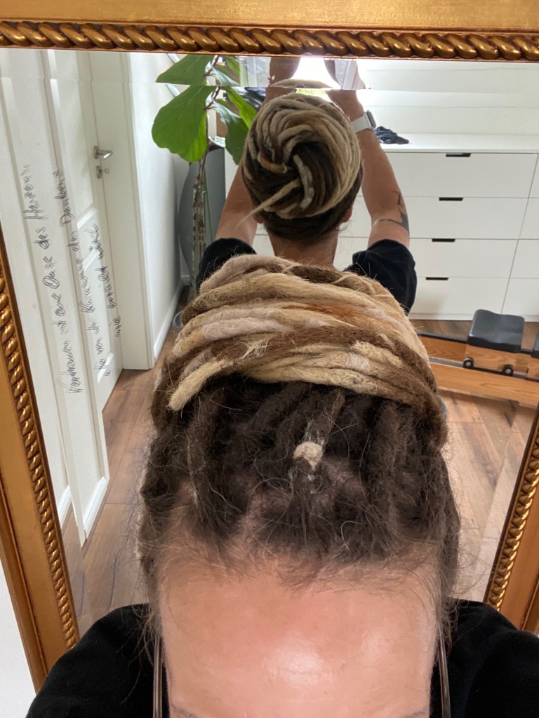 Übrigens die Knotenmethode oder auch Durchziehmethode genannt, ist sehr effektiv, denn die Ansätze und losen Haare werden damit fest vereinigt und nachhaltig verbunden. Jedoch wende ich die nicht selbst an, das überlasse ich Shapati, meiner Dreaderin. Sie zieht den Dread bis zu zweimal durch den Ansatz und verhäkelt danach den Ansatz anständig. Sie sieht mehr auf meinem Kopf, als wenn ich das erfühlen will – gerade im hinten Bereich. Und die Dreads liegen dann richtig stramm am Ansatz. Ich verhäkle das lieber etwas lockerer, denn ich hasse, ehrlich gestanden, dieses Ziepen. 🤣 Bei Shapati halte ich einfach durch. 🙃