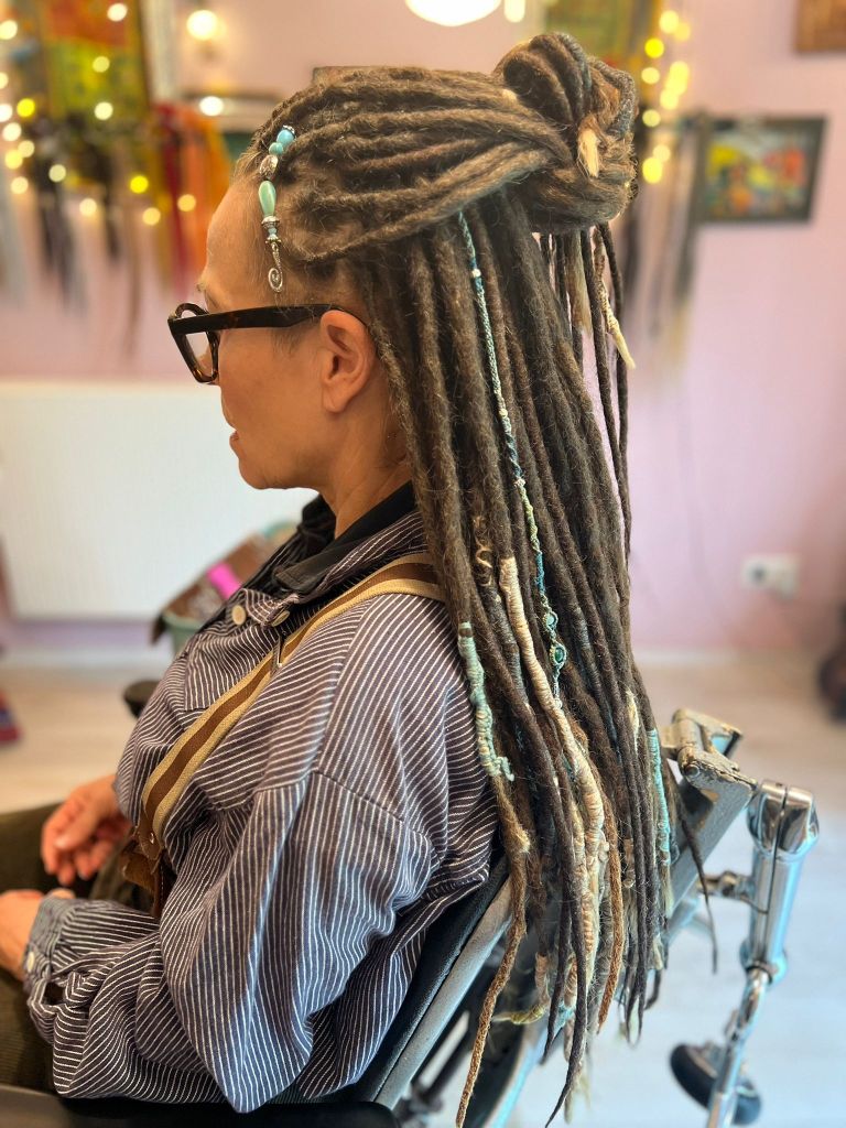 Dass die mal so schön werden, das verdanke ich Hauptsächlich Shapati. Bei den Würmchen kann man nämlich echt unverzeihliche Fehler begehen. Ich kann mich noch an die Anfänge erinnern… völlig zerzaust bin ich bei ihr hilfesuchend aufgeschlagen und war kurz davor, die Dreads abzuschneiden. Die Dreaderin, die bei mir Ansatzpflege betrieben hatte, nahm dafür eine viel zu feine Häkelnadel. Ergebnis: zerfledderte Ansätze. Ich konnte mir echt nicht vorstellen, dass Shapati es schafft, meine eigenen Fehler und die Fehler der vergangenen Dreaderinnen zu beseitigen. Doch sie hat nicht zu viel versprochen. Wie konnte ich jemals daran zweifeln. 🥳